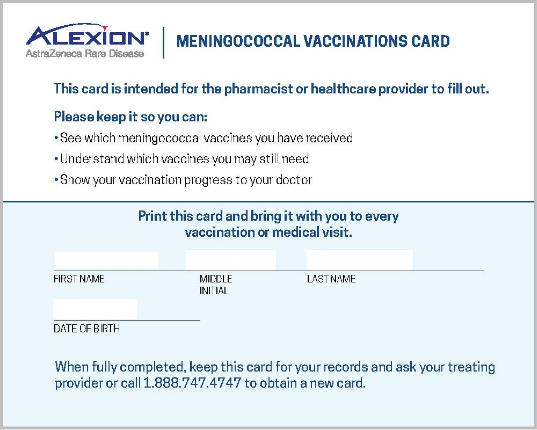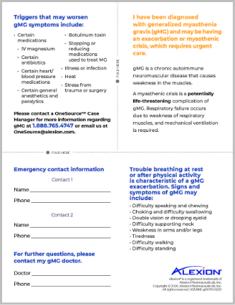 A feature of the REMS program, this card highlights the risk of meningococcal infection for gMG patients taking ULTOMIRIS and provides them information should adverse events occur.