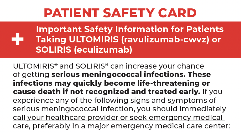 This safety card informs patients taking ULTOMIRIS about meningococcal infection symptoms they may experience and directs them to seek immediate medical attention.